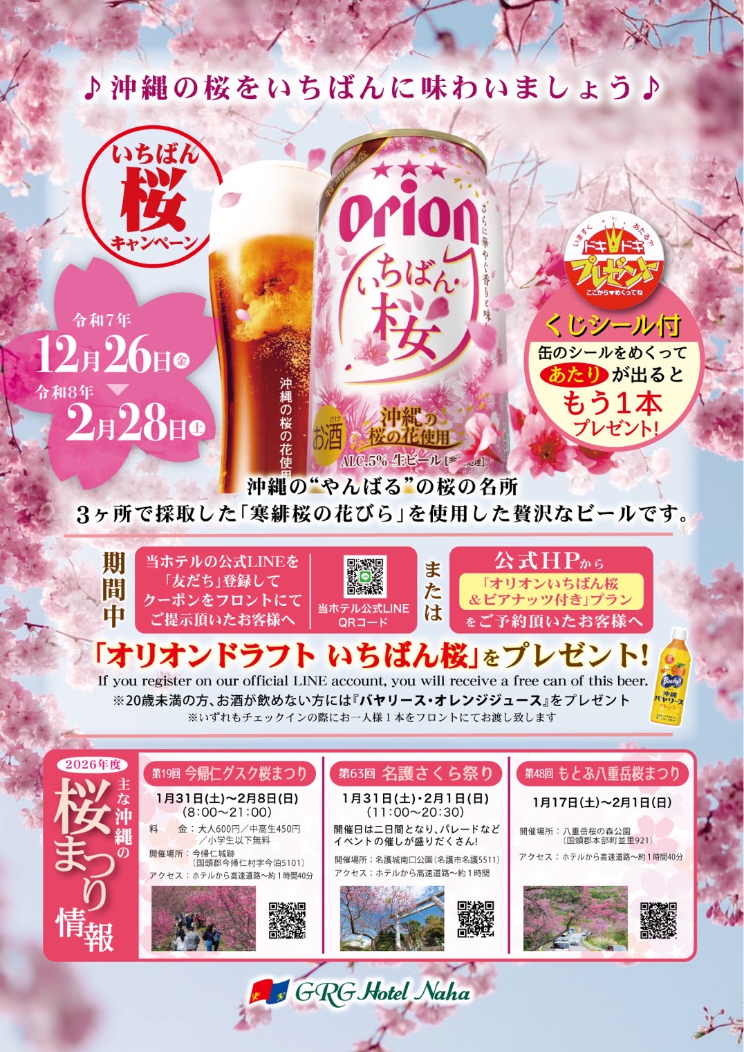 - 公式HPから予約して1本! 「オリオンいちばん桜&ビアナッツ付き」プランでご予約いただいたお客様。※1泊につき一人1本プレゼント。予約はこちらから→【季節限定!】オリオン一番桜&ビアナッツ付きプラン【朝食付】
